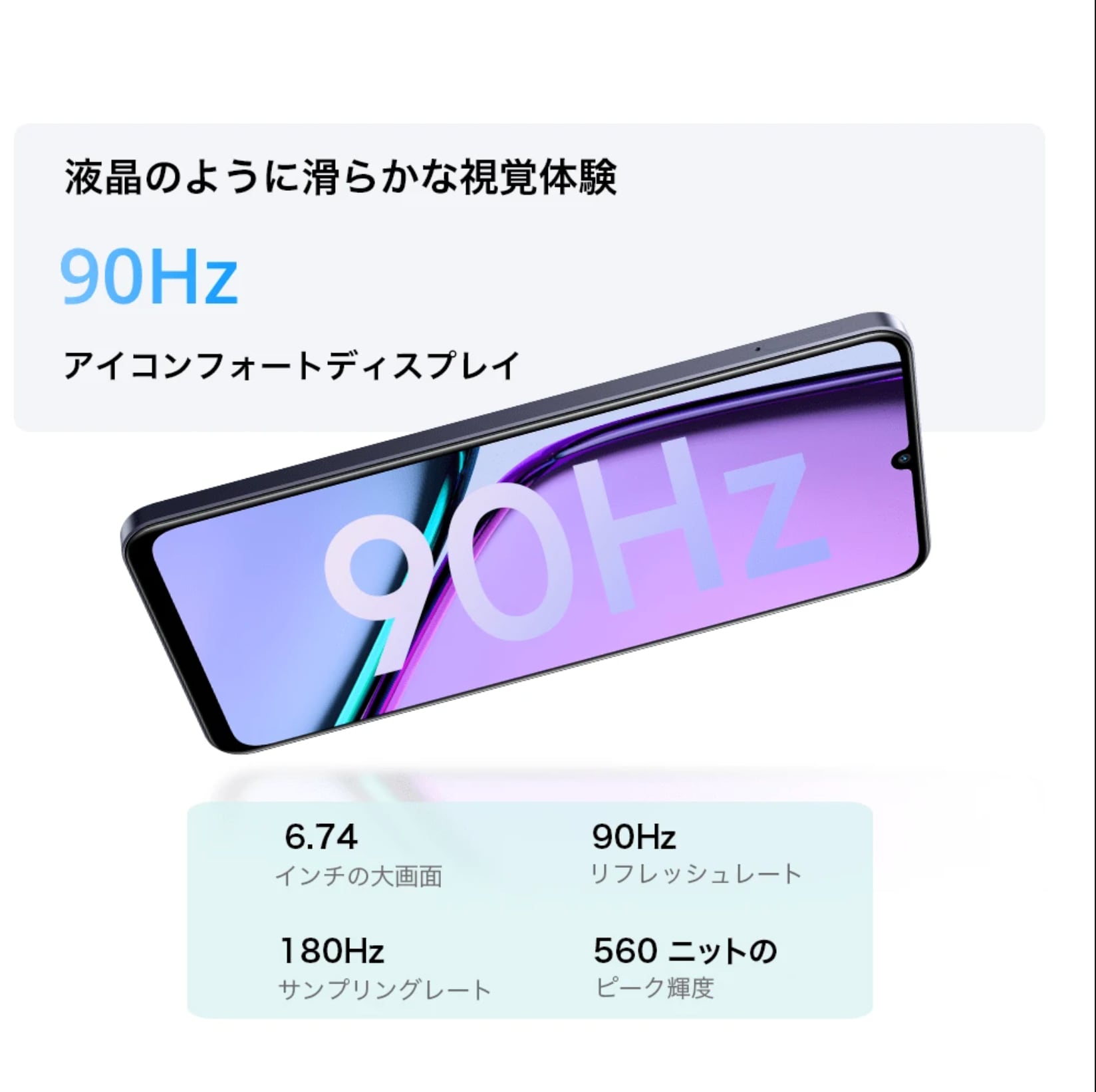 ・ディスプレイ:6.74インチ HD+(1600×720)IPS / 90Hz